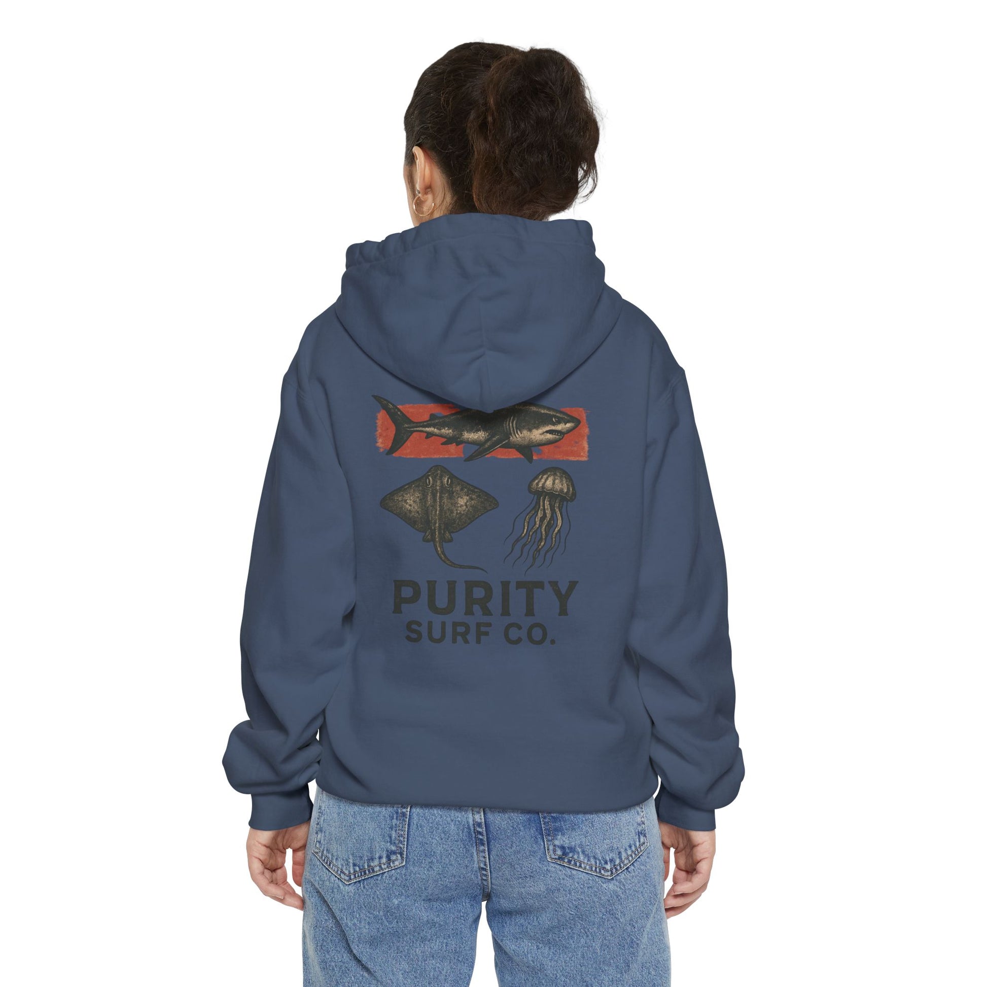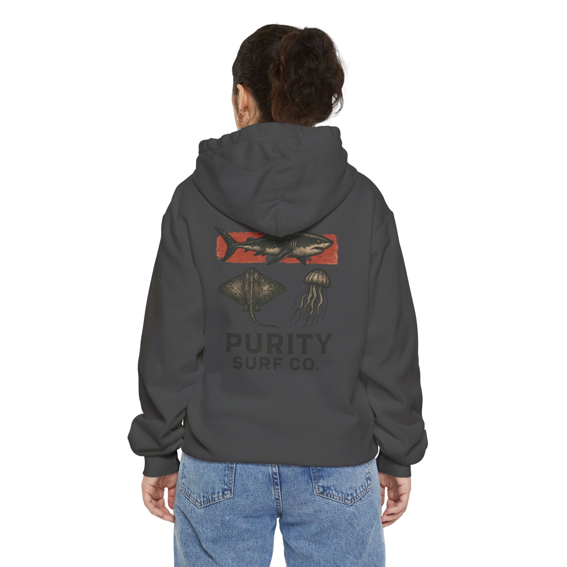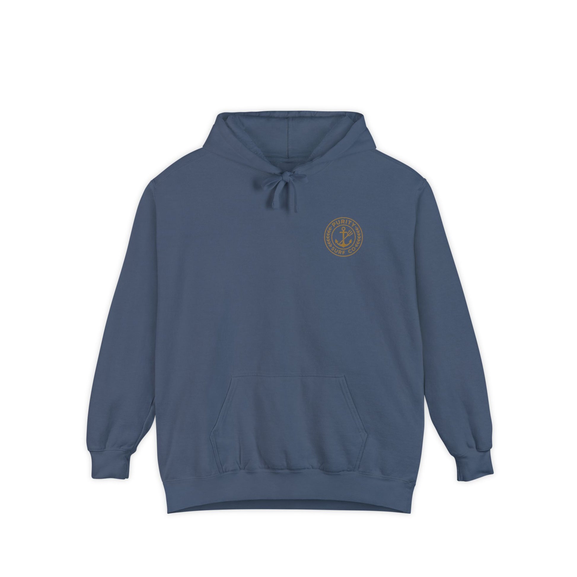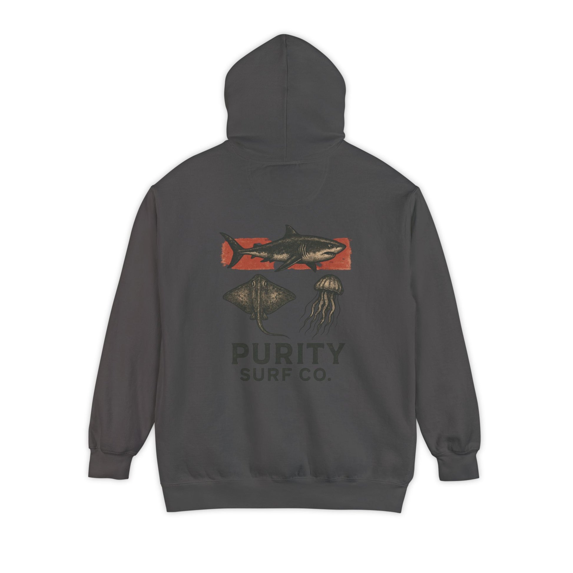 This heavy-weight garment-dyed hoodie brings a lived-in, surfboard-bag vibe to everyday wear. The charcoal fabric has a soft, brushed hand from the ringspun cotton blend and a subtle vintage fade from the garment-dye process. A small, warm-toned chest emblem hints at coastal roots, while the larger back art—an aged, stamp-like surf company crest with a Galveston skyline and rolling wave—feels like a favorite patch scavenged from road trips and beach bonfires. The roomy hood, flat drawcords, and roomy kangaroo pocket make it easy to layer over tees after a dawn surf or on chilly evenings walking the pier. Built from dense 9.5 oz fabric with ribbed cuffs and a relaxed cut, it wears like a dependable companion you reach for when you want comfort with coastal character.